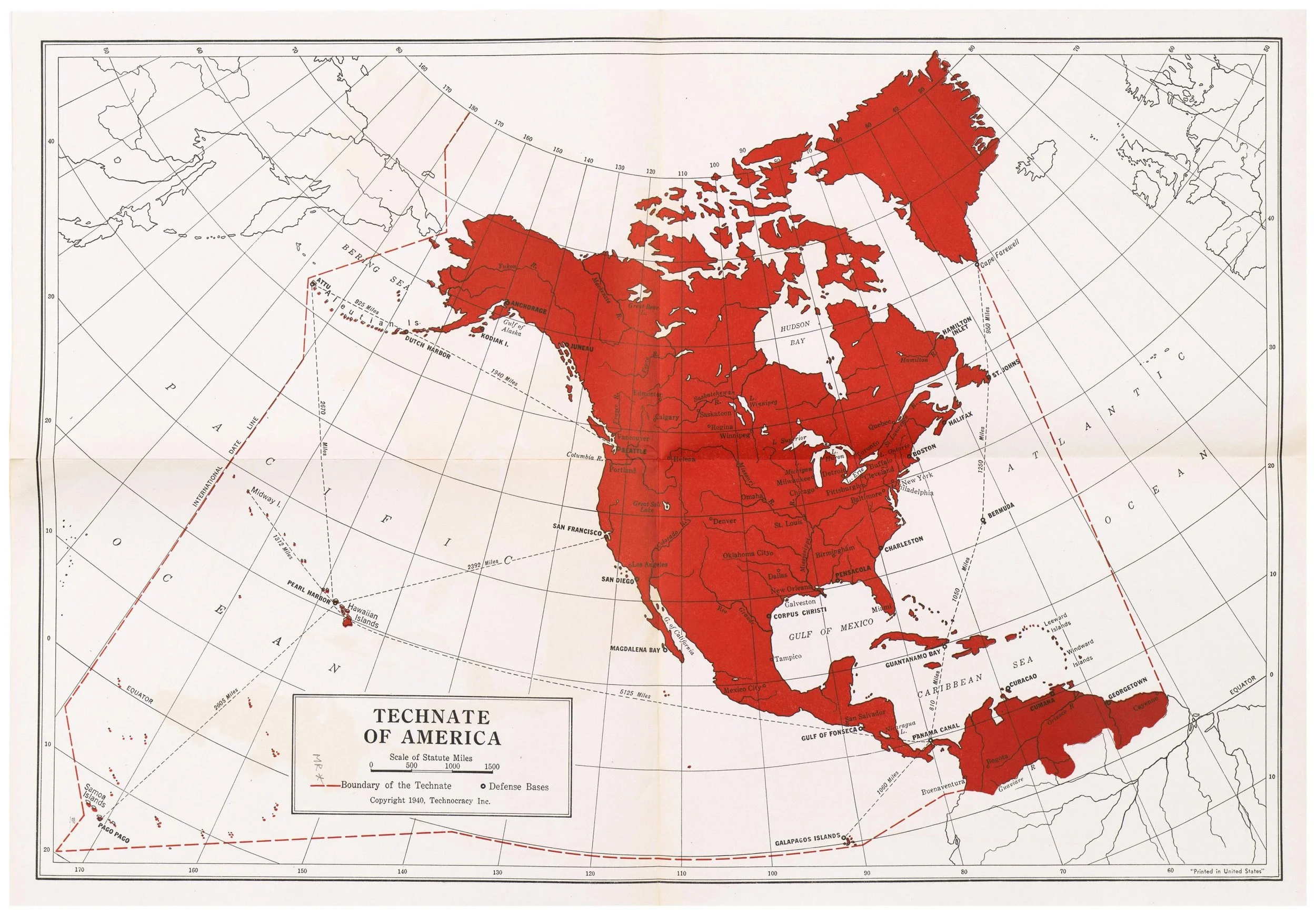 Maybe start with the featured 1940 map, labeled “Technate of America,” and notice the lack of prominent borders as it covers a land mass including not only today’s America but Canada, Mexico, Cuba, Greenland, Venezuela, and Costa Rica. That recitation might ring a bell with some rumblings of moving away from our 77-year NATO pact in favor of a tighter Western Hemisphere alliance.
